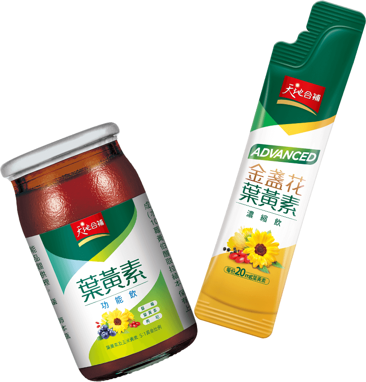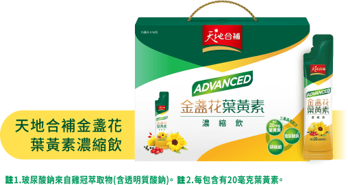 天地合補金盞花葉黃素濃縮飲使用專利雞冠萃取物(含透明質酸鈉),含小分子玻尿酸與特殊多醣及膠原形成的網狀結構,晶亮能力顯著。專利雞冠萃取物臨床研究證實有10倍晶亮效果,更有感。