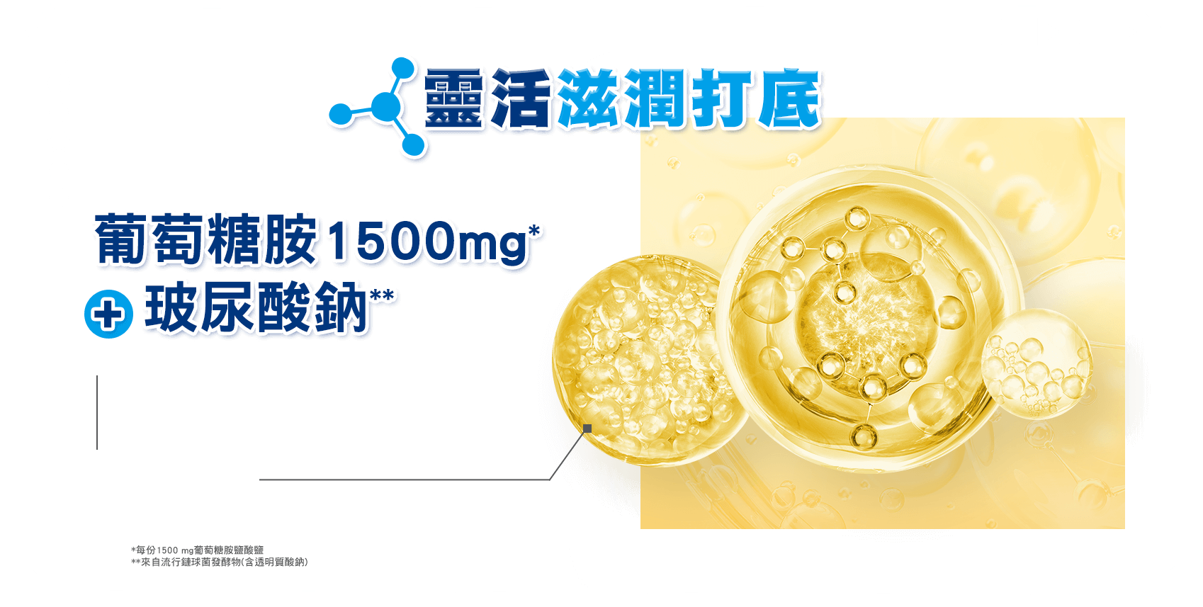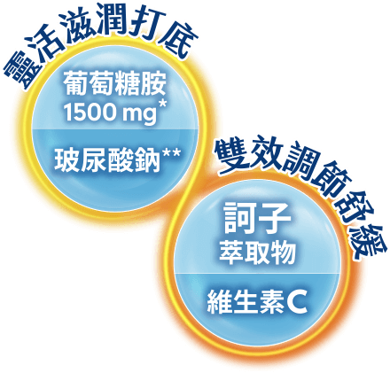 *每份1500mg葡萄糖胺鹽酸鹽 **來自流行鏈球菌發酵物(含透明質酸鈉)
